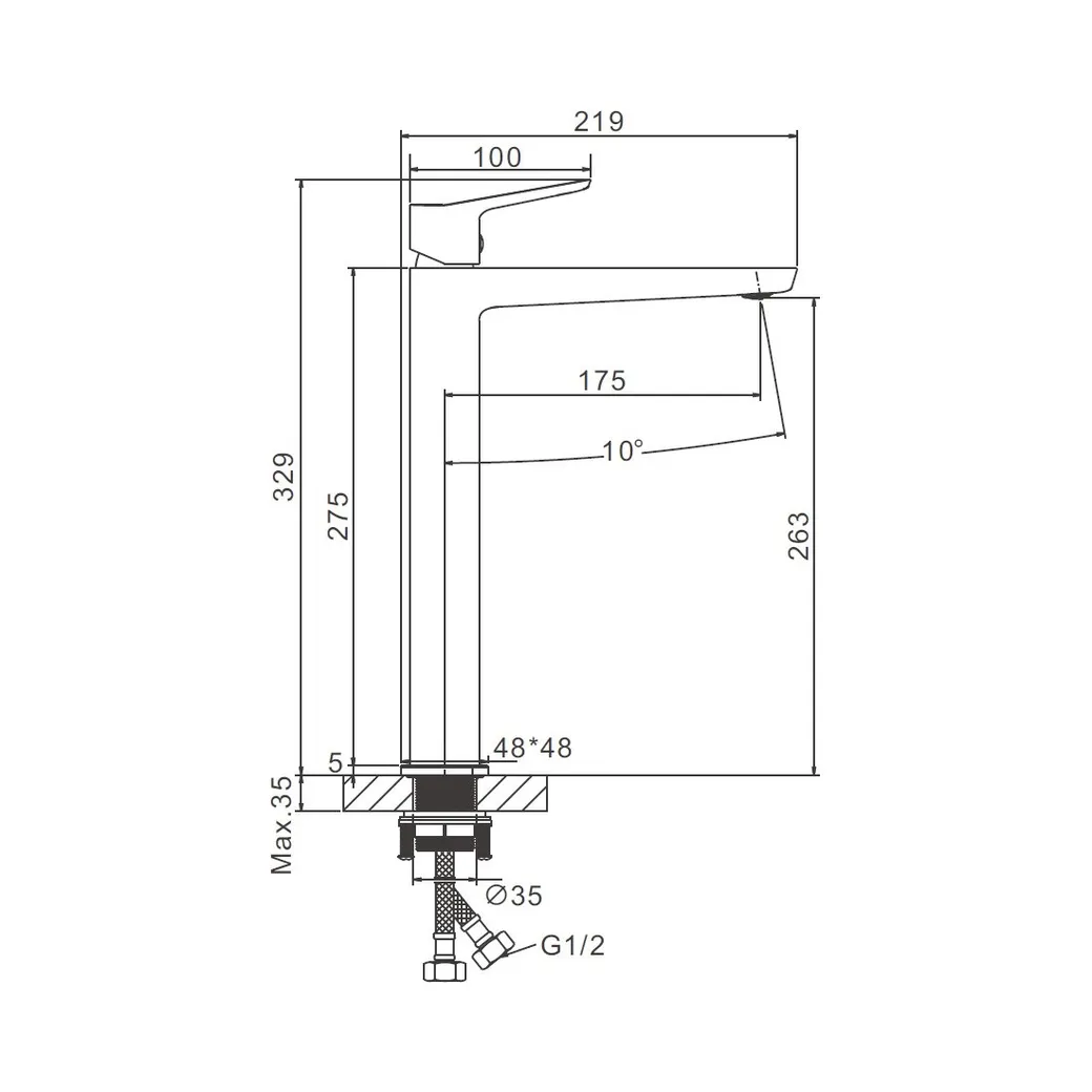 Рычажное управление обеспечивает удобство и простоту использования, а керамический картридж диаметром 26 мм гарантирует плавное и точное регулирование потока воды. Фиксированный излив смесителя оснащён аэратором, который делает струю воды более мягкой и равномерной. Максимальная толщина установки составляет 35 мм, а крепление осуществляется при помощи гайки, что обеспечивает надёжную фиксацию. Гибкая подводка длиной 45 см (M10*1-G1/2) упрощает процесс монтажа и подключения к водопроводной системе. На смеситель BELZ предоставляется гарантия 5 лет, что подтверждает его высокое качество и надёжность.