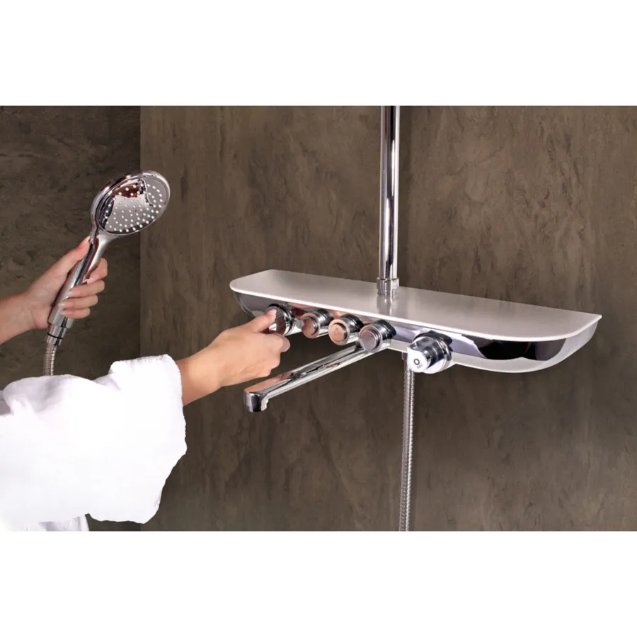 СмесительМонолитный с изливом, керамическими головками для регулировки напора и температуры вод,два кнопочные переключатели для верхнего и ручного душа керамический переключатель потолочная душевая лейка функция EasyClean, душевая штанга1000мм