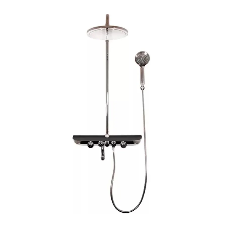 СмесительМонолитный с изливом, керамическими головками для регулировки напора и температуры вод,два кнопочные переключатели для верхнего и ручного душа керамический переключатель потолочная душевая лейка функция EasyClean, душевая штанга1100-1700мм