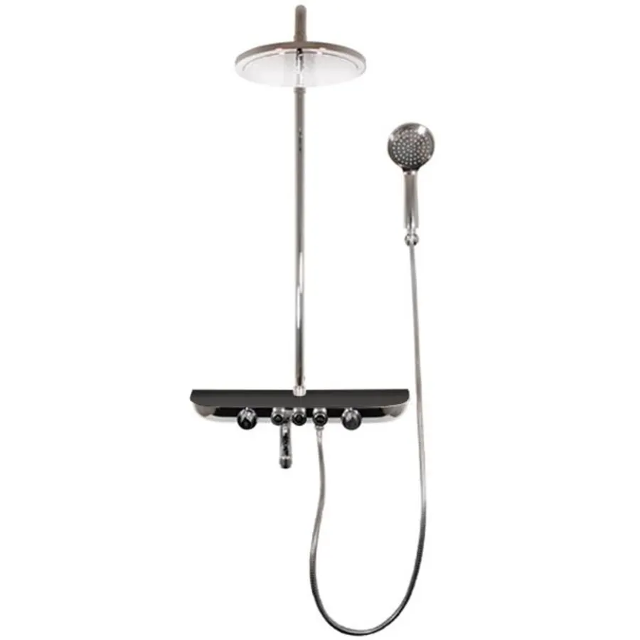 СмесительМонолитный с изливом, керамическими головками для регулировки напора и температуры вод,два кнопочные переключатели для верхнего и ручного душа керамический переключатель потолочная душевая лейка функция EasyClean, душевая штанга1100-1700мм