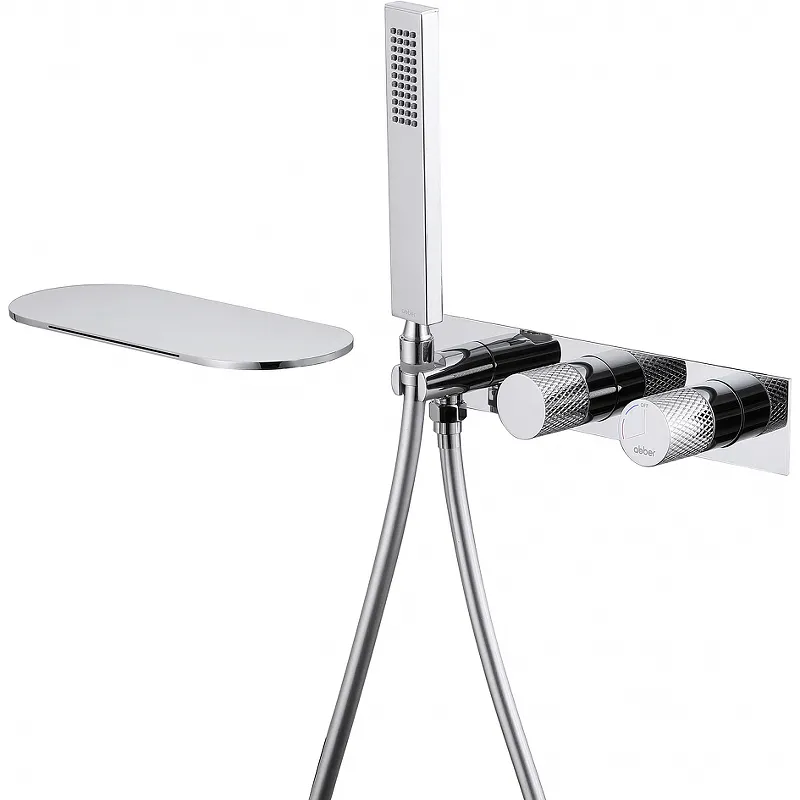 Смеситель для ванны Abber Rund AF8731.Характеристики: Цвет: хром. Материал: латунь. Управление: вентильное. Механизм: прогрессивный картридж. Излив: каскадный. Длина шланга: 150 см. Количество монтажных отверстий: 2. Стандарт подводки: 1/2. Монтаж: встраиваемый. В комплекте поставки: Смеситель (внешняя и внутренняя часть). Излив-полочка. Ручной душ. Душевой шланг. Шланговое подключение с держателем ручного душа.