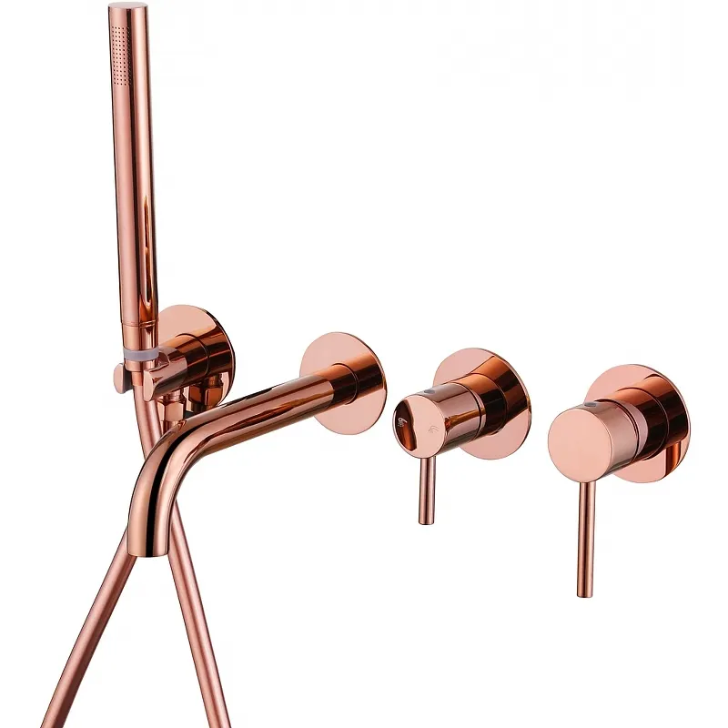 Смеситель для ванны Abber Wasser Kreis AF8130RG.Характеристики: Цвет: розовое золото. Материал: латунь. Управление: однорычажное. Механизм: керамический картридж. Излив: фиксированный. Аэратор. Количество режимов струи ручного душа: 1. Стандарт подводки: 1/2. Отверстия для монтажа: 4. Монтаж: встраиваемый. В комплекте поставки: Смеситель (внешняя и внутренняя часть). Излив. Ручной душ. Душевой шланг. Шланговое подключение с держателем ручного душа.