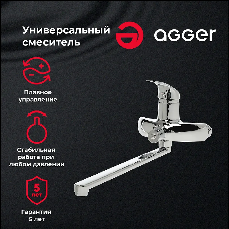 - Удобство использования: Однорычажное управление смесителем для ванны Agger обеспечивает простоту регулировки температуры и напора воды.