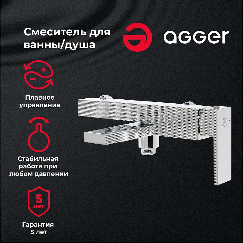 - Элегантный хромированный дизайн делает данный смеситель для ванны Agger Great не только красивым, но и практичным с точки зрения ухода — достаточно протереть его мягкой салфеткой, чтобы он сохранял блеск.