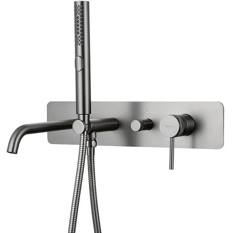 Смеситель для ванны Allen Brau Priority 5.31A05-MG с душевым гарнитуром.Характеристики: Цвет: графит брашированный. Материал: латунь. Управление: однорычажное. Механизм: керамический картридж Kerox. Излив: фиксированный. Стандарт подводки: G 1/2. Тип подводки: жесткая. Аэратор: интегрированный Neoperl. Переключатель режимов: поворотный. Материал ручного душа: ABS-пластик. Количество режимов струи ручного душа: 3. Душевой шланг из нержавеющей стали SUS304, длиной 1500 мм. Защита от перекручивания. Монтаж: встраиваемый. В комплекте поставки: Смеситель для ванны (внешняя и внутренняя части). Ручной душ. Душевой шланг. Держатель ручного душа. Аэратор.
