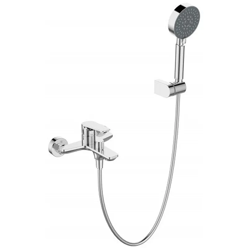 - Хромированный смеситель для ванны с фиксированным изливом средней длины гарантирует долговечность и устойчивость к коррозии.
