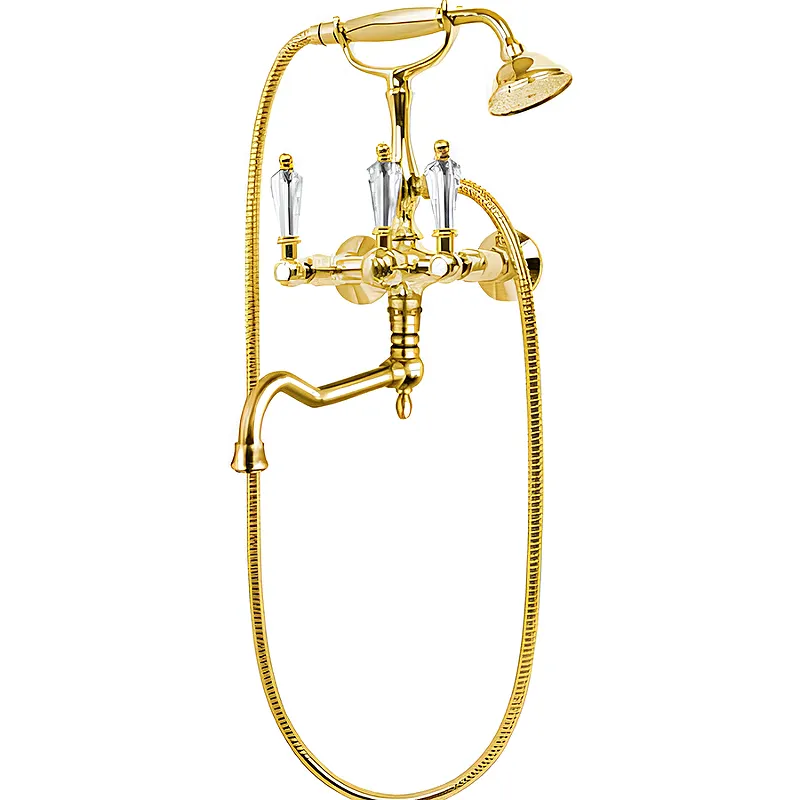 Смеситель для ванны Cezares Diamond DIAMOND-VDF-03/24-Sw с душевым гарнитуром..Характеристики: Цвет: золото 24 карат. Материал: латунь. Ручки: Swarovski. Управление: двухвентильное. Механизм: керамическая кран-букса. Излив: поворотный. Аэратор. Дивертор. Форма ручного душа: круглая. Количество режимов струи ручного душа: 1. Длина душевого шланга: 1500 мм. Стандарт подводки: G 1/2. Рабочий интервал давления в водопроводной сети: 0.5-6.0 Атм. Отверстия для монтажа: 2. Монтаж: на стену. В комплекте поставки: Смеситель для ванны. Ручной душ. Душевой шланг. Держатель для душевой лейки. Эксцентрики.