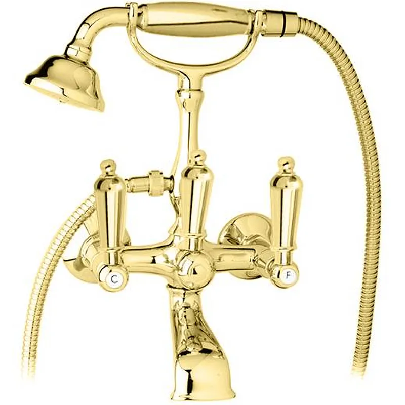 Смеситель для ванны Cezares First VD FIRST-VD-03/24-M.Характеристики: Тип управления: вентильное. Материал: высококачественная латунь с гладким покрытием, которое не теряет цвет со временем, устойчиво к царапинам и превосходно защищает от коррозии. Цвет корпуса: золото 24 карат. Цвет ручек: золото 24 карат. Дизайн: ретро. Длина излива: 15 см. Вращение излива: фиксированый. Механизм: керамическая кран-букса. Девиатор обеспечивает движение воды в нужном направлении для автоматического переключения: ванна/душ. Рабочий интервал давления: 0,5 - 6 Атм. Стандарт подводки: G 1/2 дюйма. Оснащение: девиатор, душевая лейка, душевой шланг, держатель для душа, эксцентрики. Длина душевого шланга: 150 см. Монтаж: на стену. Отверстия для монтажа: 2 отверстия. В комплекте поставки: Смеситель. Душевой гарнитур. Комплект креплений. Инструкция.