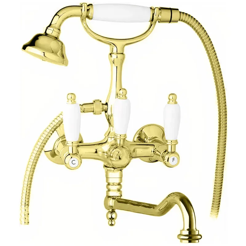 Смеситель для ванны Cezares First VDF FIRST-VDF-03/24-Bi.Характеристики: Тип управления: вентильное. Материал: высококачественная латунь с гладким покрытием, которое не теряет цвет со временем, устойчиво к царапинам и превосходно защищает от коррозии. Цвет корпуса: золото 24 карат. Цвет ручек: белый. Дизайн: ретро. Длина излива: 23.5 см. Вращение излива: поворотный. Механизм: керамическая кран-букса. Девиатор обеспечивает движение воды в нужном направлении для автоматического переключения: ванна/душ. Рабочий интервал давления: 0,5 - 6 Атм. Стандарт подводки: G 1/2 дюйма. Оснащение: девиатор, душевая лейка, душевой шланг, держатель для душа, эксцентрики. Длина душевого шланга: 150 см. Монтаж: на стену. Отверстия для монтажа: 2 отверстия. В комплекте поставки: Смеситель. Душевой гарнитур. Комплект креплений. Инструкция.