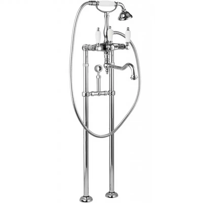 Смеситель для ванны Cezares First VDPS2 FIRST-VDPS2-01-Bi.Характеристики: Тип управления: вентильное. Материал: высококачественная латунь с гладким покрытием, которое не теряет цвет со временем, устойчиво к царапинам и превосходно защищает от коррозии. Цвет корпуса: хром. Цвет ручек: белый. Дизайн: ретро. Излив: поворотный. Механизм: керамическая кран-букса. Девиатор обеспечивает движение воды в нужном направлении для автоматического переключения: ванна/душ. Рабочий интервал давления: 0,5 - 6 Атм. Стандарт подводки: G 1/2 дюйма. Оснащение: девиатор, душевая лейка, душевой шланг, держатель для душа, универсальный установочный комплект. Кронштейн для слива-перелива. Длина душевого шланга: 150 см. Монтаж: на пол. Отверстия для монтажа: 2 отверстия. В комплекте поставки: Смеситель. Душевой гарнитур. Комплект креплений. Инструкция.