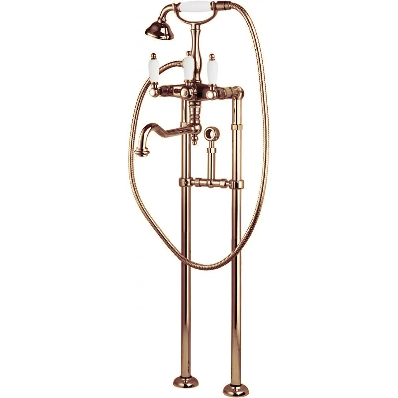 Смеситель для ванны Cezares First VDPS2 FIRST-VDPS2-02-Bi.Характеристики: Тип управления: вентильное. Материал: высококачественная латунь с гладким покрытием, которое не теряет цвет со временем, устойчиво к царапинам и превосходно защищает от коррозии. Цвет корпуса: бронза. Цвет ручек: белый. Дизайн: ретро. Излив: поворотный. Механизм: керамическая кран-букса. Девиатор обеспечивает движение воды в нужном направлении для автоматического переключения: ванна/душ. Рабочий интервал давления: 0,5 - 6 Атм. Стандарт подводки: G 1/2 дюйма. Оснащение: девиатор, душевая лейка, душевой шланг, держатель для душа, универсальный установочный комплект. Кронштейн для слива-перелива. Длина душевого шланга: 150 см. Монтаж: на пол. Отверстия для монтажа: 2 отверстия. В комплекте поставки: Смеситель. Душевой гарнитур. Комплект креплений. Инструкция.
