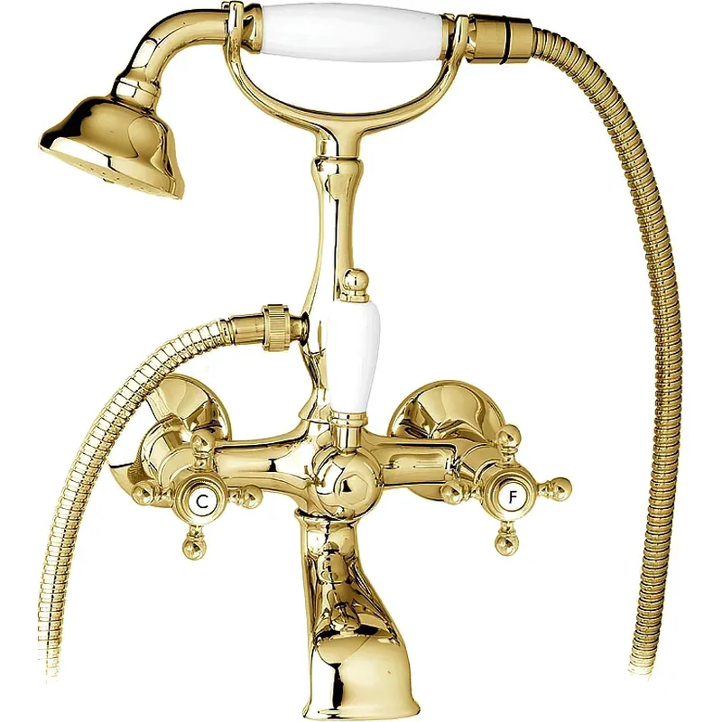 Смеситель для ванны Cezares Golf-VD-03/24-Bi.Характеристики: Цвет корпуса: золото 24 карат. Цвет ручек: белый. Материал: латунь. Управление: вентильное. Излив: фиксированный. Механизм: керамическая кран-букса. Тип подводки: G1/2. Отверстия для монтажа: 2 отверстия. Монтаж: на стену. Рабочий интервал давления: 0,5-6,0 Атм. В комплекте поставки: Смеситель. Душевая лейка. Душевой шланг. Эксцентрики.
