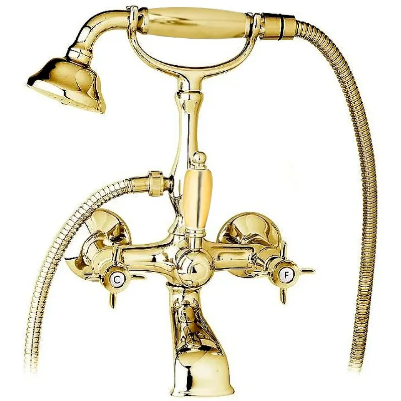 Смеситель для ванны Cezares Lord LORD-VD-03/24-M с душевым гарнитуром.Характеристики: Цвет: золото 24 карат. Цвет ручки: золото 24 карат. Материал: латунь. Управление: двухвентильное. Механизм: керамическая кран-букса. Излив: фиксированный. Стандарт подводки: G1/2. Аэратор. Количество режимов струи ручного душа: 1. Рабочий интервал давления в водопроводной сети: 0.5-6.0 Атм. Монтаж: на стену. В комплекте поставки: Смеситель для ванны. Ручной душ. Душевой шланг. Держатель ручного душа. Эксцентрики. Комплект креплений.