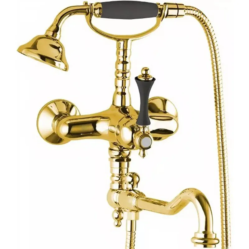Смеситель для ванны Cezares Margot MARGOT-VDFM2-03/24-N.Характеристики: Цвет: золото 24 карат. Цвет ручек: черный. Материал: латунь. Управление: однорычажное. Механизм: керамический картридж. Излив: поворотный. Аэратор. Дивертор. Форма ручного душа: круглая. Количество режимов струи ручного душа: 1. Длина душевого шланга: 1500 мм. Отверстия для монтажа: 2. Стандарт подводки: G 1/2. Рабочий интервал давления в водопроводной сети: 0.5-6.0 Атм. Монтаж: на стену. В комплекте поставки: Смеситель для ванны. Ручной душ. Душевой шланг. Держатель ручного душа. Комплект креплений.