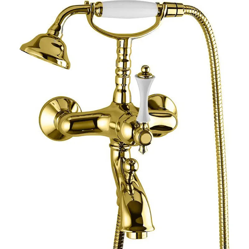 Настенный смеситель для ванны Cezares Margot MARGOT-VDM-03/24-Bi однорычажный, с аэратором, с душевым гарнитуром, монтируемый в два отверстия.Характеристики: Цвет: золото 24 карат. Цвет ручек: белый. Материал: латунь. Фиксированный излив: 14,5 см. Управление: рычажное. Механизм: керамический картридж. Переключатель душ/излив. Однорежимная душевая лейка. Размер лейки: 8 см. Фиксированный держатель лейки на смесителе. Гибкий душевой шланг. Стандарт подключения: G 1/2. Расстояние между центрами креплений: 15+/-2,5 см. Рабочий интервал давления: 0,5-6 Атм. В комплекте поставки: Смеситель. Душевая лейка. Душевой шланг. Аэратор. Держатель для душевой лейки. Дивертор. Комплект креплений.