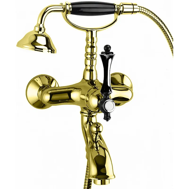 Смеситель для ванны Cezares Margot MARGOT-VDM-03/24-Ni.Характеристики: Цвет: золото 24 карат. Цвет ручек: черный. Материал: латунь. Управление: однорычажное. Механизм: керамический картридж. Излив: фиксированный. Аэратор. Дивертор. Форма ручного душа: круглая. Количество режимов струи ручного душа: 1. Длина душевого шланга: 1500 мм. Отверстия для монтажа: 2. Стандарт подводки: G 1/2. Рабочий интервал давления в водопроводной сети: 0.5-6.0 Атм. Монтаж: на стену. В комплекте поставки: Смеситель для ванны. Ручной душ. Душевой шланг. Держатель ручного душа. Комплект креплений.