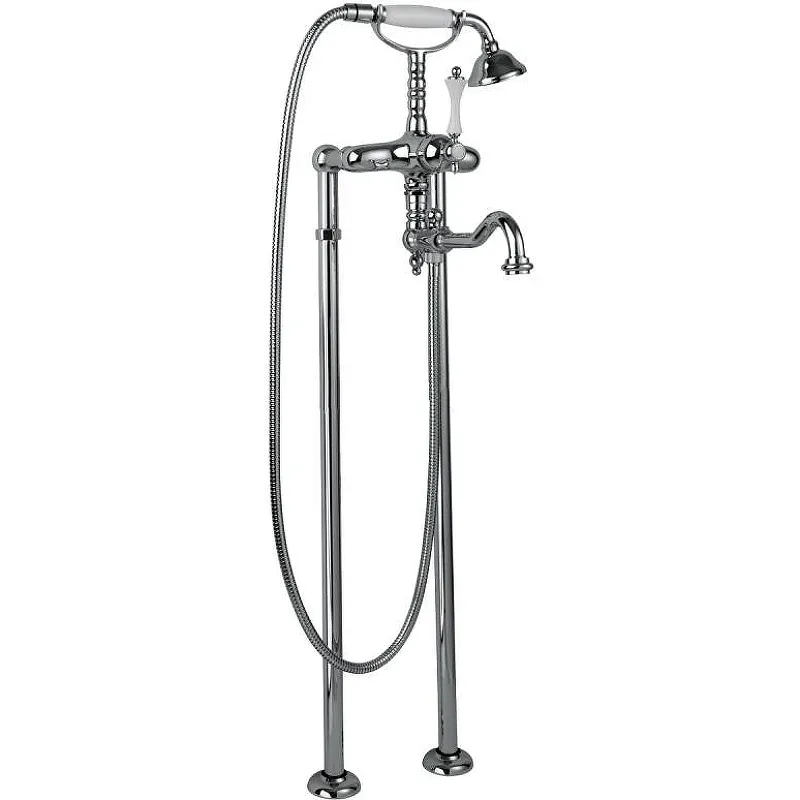 Смеситель для ванны Cezares Margot MARGOT-VDP2-01-Bi однорычажный, с аэратором, с душевым гарнитуром, с напольными колоннами, монтируемый в два отверстия.Характеристики: Цвет: хром. Цвет ручки: белый. Материал: латунь. Управление: рычажное. Поворотный излив. Длина излива: 29,5 см. Механизм: керамический картридж. С аэратором. Переключатель душ/излив. Душевая лейка: однорежимная. Размер лейки: 8 см. Держатель лейки: фиксированный, на корпусе смесителям. Душевой шланг: гибкий, длиной 150 см. Стандарт подключения: G 1/2. Отверстия для монтажа: 2 отверстия. Рабочий интервал давления: 0,5-6 Атм. В комплекте поставки: Смеситель. Душевая лейка. Душевой шланг. Аэратор. Держатель для душевой лейки. Дивертор. Универсальный установочный комплект.