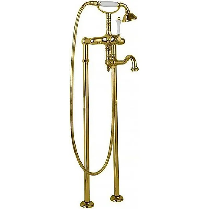 Смеситель для ванны Cezares Margot MARGOT-VDP2-03/24-Bi однорычажный, с аэратором, с душевым гарнитуром, с напольными колоннами, монтируемый в два отверстия.Характеристики: Цвет: золото 24 карат. Цвет ручки: белый. Материал: латунь. Управление: рычажное. Поворотный излив. Длина излива: 29,5 см. Механизм: керамический картридж. С аэратором. Переключатель душ/излив. Душевая лейка: однорежимная. Размер лейки: 8 см. Держатель лейки: фиксированный, на корпусе смесителям. Душевой шланг: гибкий, длиной 150 см. Стандарт подключения: G 1/2. Отверстия для монтажа: 2 отверстия. Рабочий интервал давления: 0,5-6 Атм. В комплекте поставки: Смеситель. Душевая лейка. Душевой шланг. Аэратор. Держатель для душевой лейки. Дивертор. Универсальный установочный комплект.