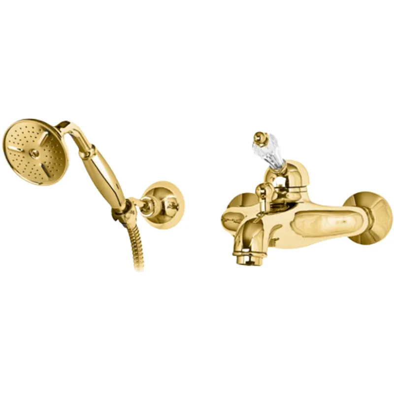 Смеситель для ванны Cezares Vintage VINTAGE-VDM-03/24-Sw.Характеристики: Поверхность: золото 24 карат. Ручка: кристалл Swarovski. Управление: рычажное. Материал: латунь. Длина излива: 16,8 см. Механизм: керамический картридж. Отверстия для монтажа: 2 отверстия. Стандарт подводки: 1/2. Оснащение: душевой шланг, душевая лейка, настенный держатель, эксцентрики, аэратор, дивертор. Рабочий интервал давления в водопроводной сети: 0,5-6,0 Атм. Переключатель душ/излив. Душевая лейка: однорежимная. Душевой шланг: гибкий. В комплекте поставки: Смеситель. Душевая лейка. Держатель душевой лейки. Инструкция.