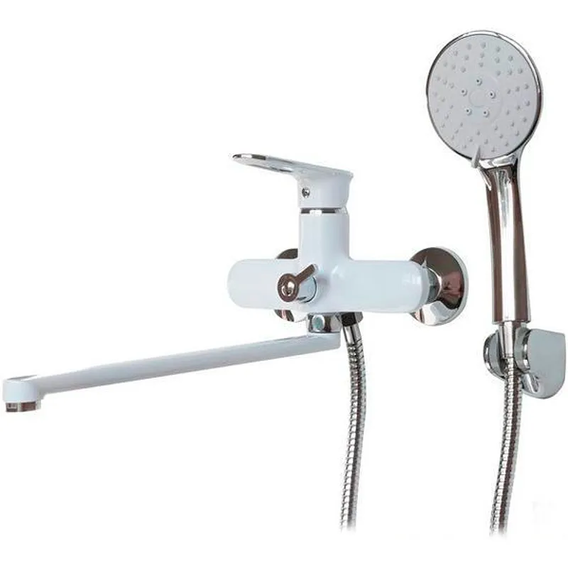Смеситель для ванны Frap H49 F2249 универсальный, с душевым гарнитуром.Характеристики: Цвет: белый, хром. Материал: латунь. Управление: однорычажное. Механизм: керамический картридж. Излив: поворотный. Монтаж: на стену. Тип подводки: жесткая. Стандарт подводки: G 1/2. Длина шланга: 1500 мм. В комплекте поставки: Смеситель для ванны. Душевой шланг. Душевая лейка. Держатель лейки. Комплект отражателей. Комплект эксцентриков.