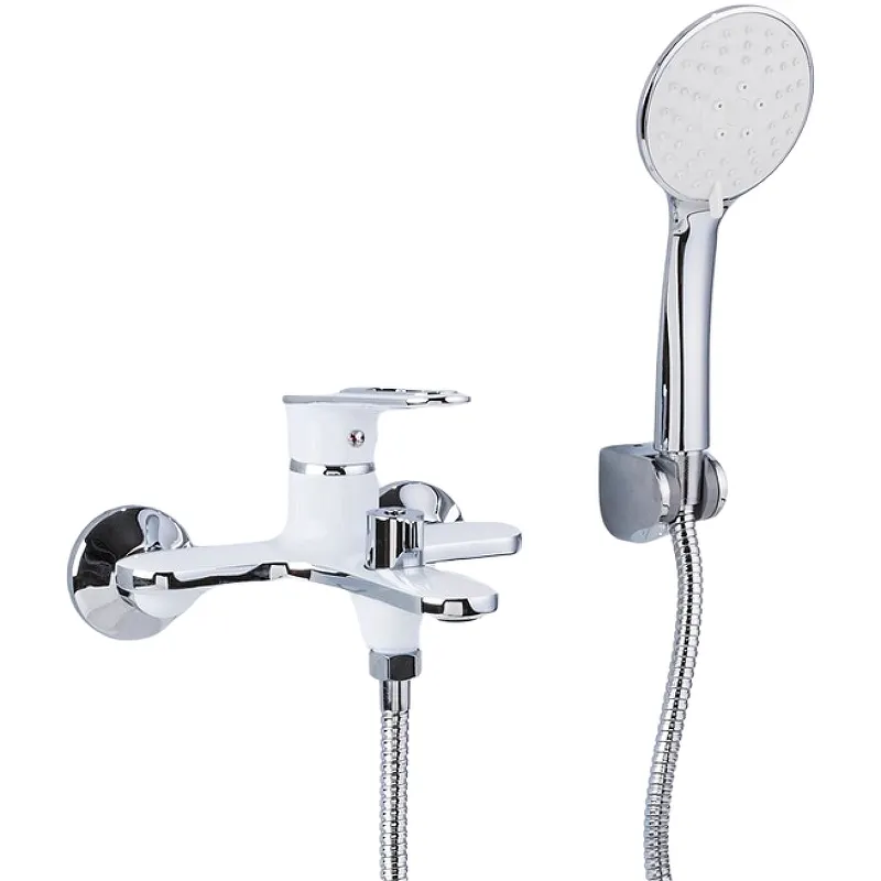 Смеситель для ванны Frap H49 F3249 с душевым гарнитуром.Характеристики: Цвет: белый, хром. Материал: латунь. Управление: однорычажное. Механизм: керамический картридж. Излив: фиксированный. Монтаж: на стену. Тип подводки: жесткая. Стандарт подводки: G 1/2. Длина шланга: 1500 мм. В комплекте поставки: Смеситель для ванны. Душевой шланг. Душевая лейка. Держатель лейки. Комплект отражателей. Комплект эксцентриков.