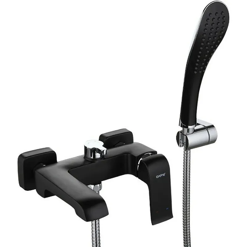 Смеситель для ванны Gappo G50 G3250 универсальный, с душевым гарнитуром.Характеристики: Цвет: черный матовый. Материал: латунь. Управление: однорычажное. Механизм: керамический картридж 35 мм. Излив: фиксированный. Монтаж: на стену. Аэратор. Тип подводки: жесткая. Стандарт подводки: 1/2. Длина шланга: 1.5 м. Отверстий для монтажа: 2. В комплекте поставки: Смеситель для ванны. Душевой шланг. Душевая лейка. Держатель лейки. Комплект отражателей. Комплект эксцентриков. Комплект креплений.