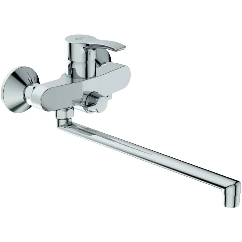 Смеситель для ванны Ideal Standard Alpha BD044AA универсальный.Характеристики: Цвет: хром. Материал: латунь. Управление: однорычажное. Механизм: керамический картридж, 35 мм. Функция HWTC (ограничение максимальной температуры горячей воды). Функция CLICK (ограничение потока воды). Излив: поворотный. Стандарт подводки: 1/2. Аэратор Perlator. Металлическая рукоятка с индикаторами горячей/холодной воды. Ручное переключение ванна/душ. Обратный клапан. Количество отверстий для монтажа: 2. Монтаж: на стену. В комплекте поставки: Смеситель для ванны.