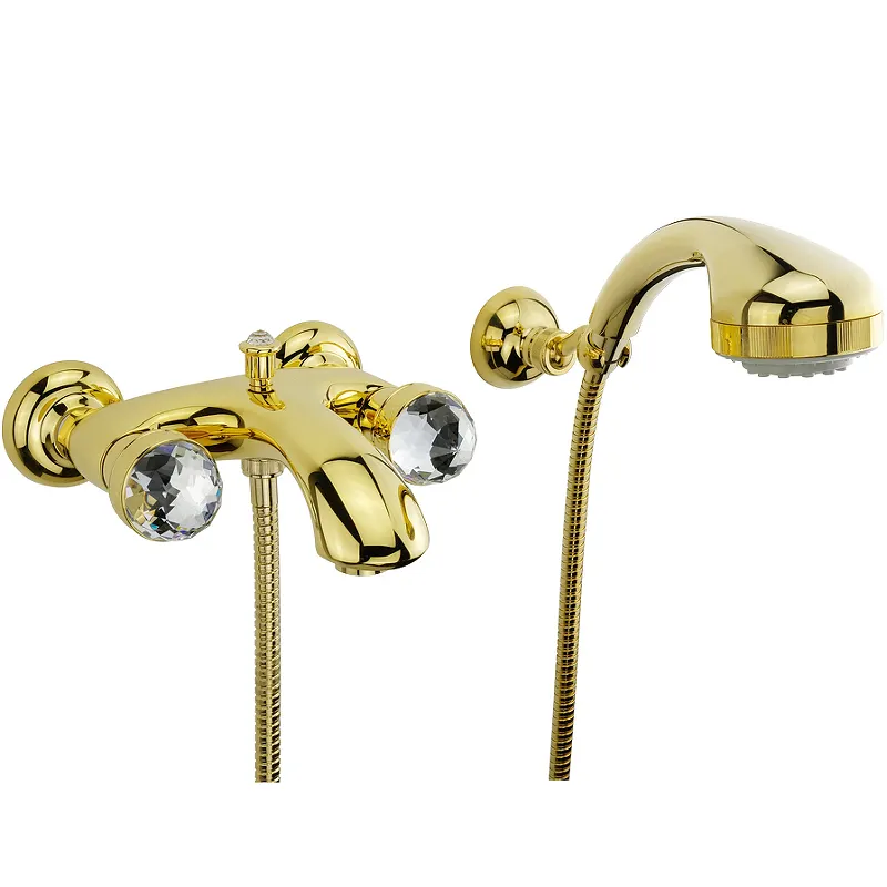 Смеситель для ванны Migliore Axo 18505 станет великолепным украшением Вашей ванной комнаты. Поможет в создании уникального дизайна помещения в классическом или ретро стиле. Отличается округлой формой корпуса и ручками из кристаллов Swarovski.Характеристики: Цвет: золото. Материал: высококачественный латунный сплав. Специальное лаковое покрытие защищает внешнюю часть смесителя от быстрого износа. Фиксированный излив с аэратором. Двухвентильная система управления. Ручки инкрустированы кристаллами Swarovski. Керамические кран-буксы. Переключатель на ручной душ. Защита от обратного потока. Совместим с проточным водонагревателем. Стандарт подключения: G 1/2. Монтаж: на стену. В комплекте поставки: смеситель, лейка, шланг, держатель.