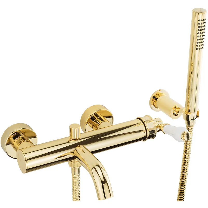 Смеситель для ванны Migliore Ermitage Mini 28590 c душевым гарнитуром.Характеристики: Цвет: золото. Цвет ручки: белая. Материал: латунь, керамика. Фиксированный излив. Аэратор. Душевая лейка с одним режимом струи. Металлический шланг 1500 мм. Настенный держатель. Девиатор. Управление: однорычажное. Механизм: керамический картридж. Защита от обратного потока. Совместим с проточным водонагревателем. Стандарт подключения: 1/2. Монтаж: на стену. В комплекте поставки: Смеситель. Душевой гарнитур.