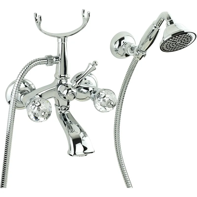 Смеситель для ванны Migliore Korona 27307.Станет великолепным украшением Вашей ванной комнаты. Поможет в создании уникального дизайна ванной комнаты в классическом или ретро стиле. Отличается округлой формой корпуса и ручками из кристаллов Сваровски. Роскошь и функциональность. Итальянское качество.Характеристики: Цвет: хром. Материал: латунь, кристаллы Swarovski. Специальное лаковое покрытие защищает внешнюю часть смесителя от быстрого износа. Фиксированный излив с аэратором. Двухвентильная система управления. Керамические кран-буксы. Переключатель на ручной душ. С душевым гарнитуром. Стандарт подключения: G 1/2. Монтаж: на стену. В комплекте поставки: Смеситель. Лейка. Шланг. Держатель.