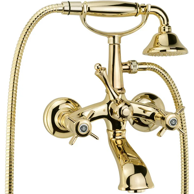 Смеситель для ванны Migliore Korona 28506 с душевым гарнитуром.Характеристики: Цвет: золото. Материал: латунь. Девиатор. Аэратор. Отверстия для монтажа: 2. Стандарт подводки: G 1/2. Излив: фиксированный. Механизм: керамическая кран-букса. Монтаж: на стену. Длина шланга: 150 см. Защита от обратного потока. Совместимость с проточным водонагревателем. В комплекте поставки: Смеситель. Душевой шланг. Ручной душ. Настенный держатель. Эксцентрики. Комплект креплений.
