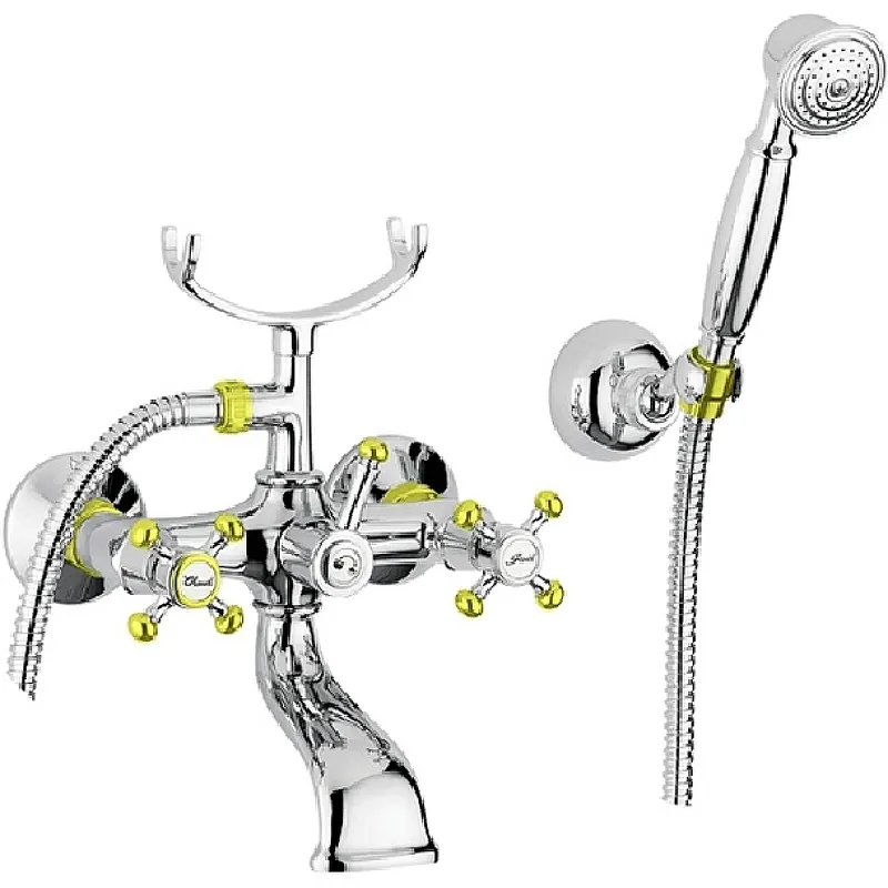 Смеситель для ванны Migliore Lady 18835 с душевым гарнитуром.Характеристики: Цвет: хром, золото. Материал: высококачественный латунный сплав, который обеспечивает прочность, устойчивость к влаге и температурным перепадам. Специальное лаковое покрытие защищает внешнюю часть смесителя от быстрого износа. Фиксированный излив с аэратором. Двухвентильная система управления. Крестообразные ручки выполнены из металла. Керамические кран-буксы. Переключатель на ручной душ. Душевой гарнитур: ручной душ, металлический шланг, настенный регулируемый держатель. Стандарт подключения: G 1/2 дюйма. Монтаж: на стену. В комплекте поставки: Смеситель для ванны. Душевой гарнитур.