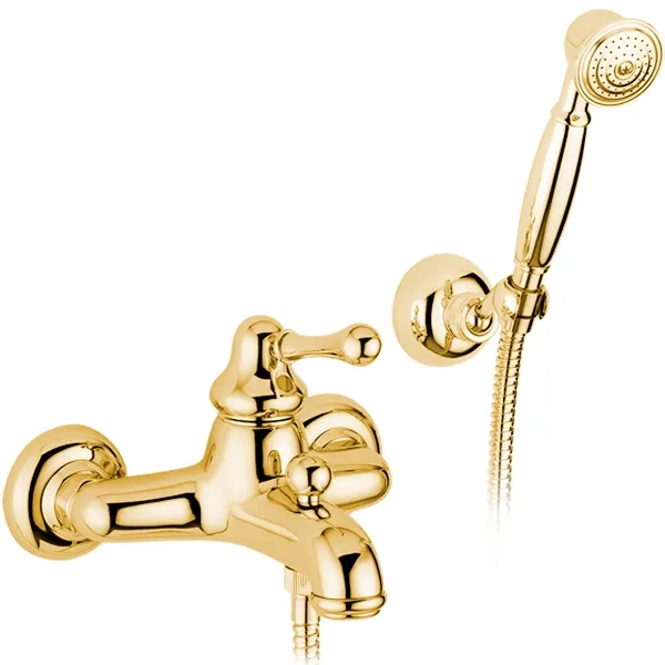 Смеситель для ванны Migliore Maya 18928.Однорычажный смеситель с фиксированным изливом и аэратором, с душевым гарнитуром.Характеристики: Монтаж: на стену. Отверстий для монтажа: 2. Стандарт подключения: G 1/2. Материал: высококачественный латунный сплав, который обеспечивает прочность, устойчивость к влаге и температурным перепадам. Покрытие: специальное лаковое покрытие защищает внешнюю часть смесителя от быстрого износа. Цвет: золото. Однорычажная система управления. Переключатель на ручной душ. Механизм: керамический картридж. Фиксированный излив с аэратором. Душевой гарнитур: ручной душ, металлический шланг, настенный регулируемый держатель. Совместимость с проточным водонагревателем. В комплекте поставки: Смеситель. Лейка однофункциональная. Шланг металлический, подключение к лейке. Настенный регулируемый держатель для душа.