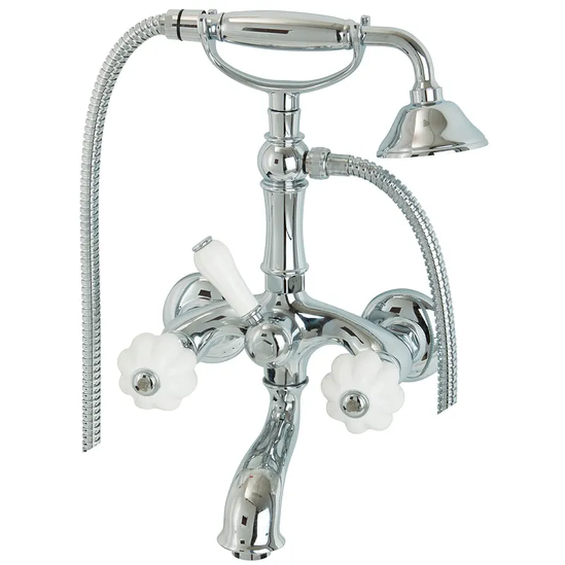 Смеситель для ванны Migliore Olivia 19004. Двухвентильный смеситель для ванны и душа с фиксированным изливом и аэратором, с душевым гарнитуром.Характеристики: Монтаж: на стену. Отверстий для монтажа: 2. Стандарт подключения: G 1/2. Материал: высококачественный латунный сплав, который обеспечивает прочность, устойчивость к влаге и температурным перепадам. Покрытие: специальное лаковое покрытие защищает внешнюю часть смесителя от быстрого износа. Цвет: хром. Ручки округлой формы и переключатель на ручной душ выполнены из белой керамики. Двухвентильная система управления. Керамические кран-буксы. Совместимость с проточным водонагревателем. Душевой гарнитур: ручной душ, металлический шланг, держатель. В комплекте поставки: Смеситель с держателем для душа. Лейка однофункциональная. Шланг металлический, подключение к лейке.