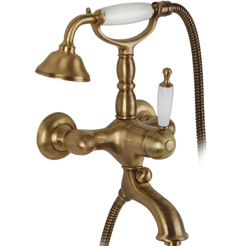 Смеситель для ванны Migliore Oxford 19085.Характеристики: Цвет: бронза. Материал: высококачественный латунный сплав. Специальное лаковое покрытие защищает внешнюю часть смесителя от быстрого износа. Однорычажная система управления. Утонченная ручка выполнена в белом цвете. Керамический картридж. Фиксированный излив с аэратором. Защита от обратного потока. Совместим с проточным водонагревателем. Переключатель на ручной душ. Душевой гарнитур: ручной душ, металлический шланг, держатель. Стандарт подключения: G 1/2. Монтаж: на стену. В комплекте поставки: смеситель, лейка, шланг, держатель.