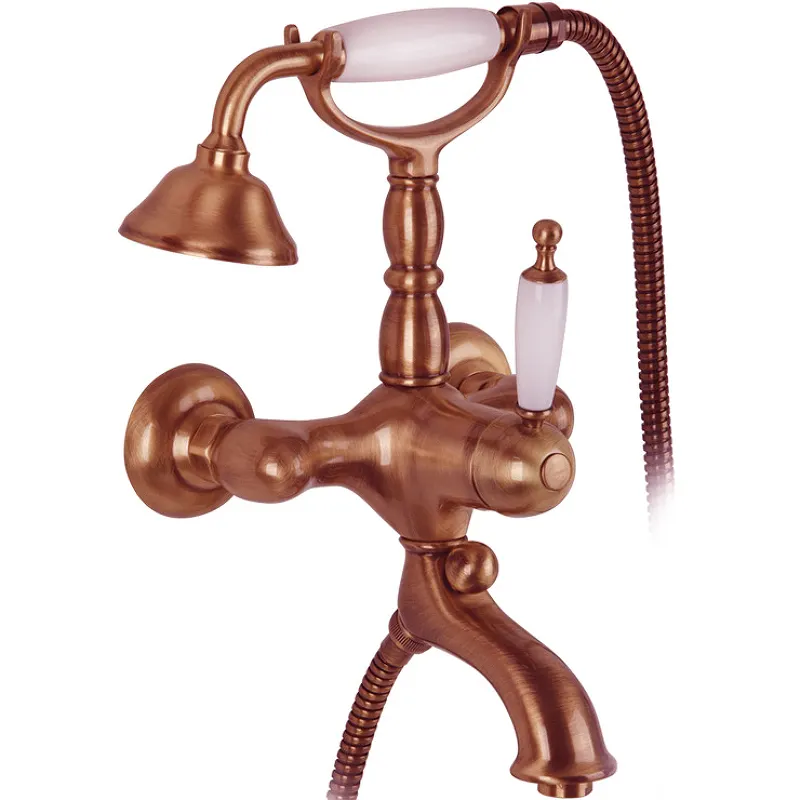 Смеситель для ванны Migliore Oxford 19193.Характеристики: Цвет: медь. Материал: высококачественный латунный сплав. Специальное лаковое покрытие защищает внешнюю часть смесителя от быстрого износа. Однорычажная система управления. Утонченная ручка выполнена в белом цвете. Керамический картридж. Фиксированный излив с аэратором. Защита от обратного потока. Совместим с проточным водонагревателем. Переключатель на ручной душ. Душевой гарнитур: ручной душ, металлический шланг, держатель. Стандарт подключения: G 1/2. Монтаж: на стену. В комплекте поставки: смеситель, лейка, шланг, держатель.
