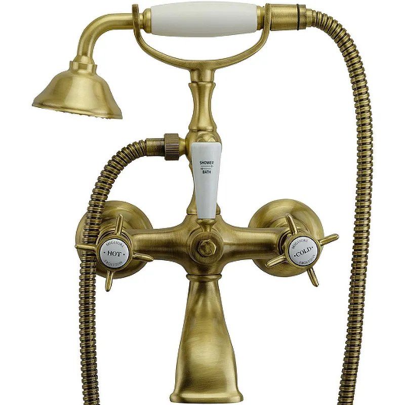 Смеситель для ванны Migliore Princeton 19344 с душевым гарнитуром.Характеристики: Цвет: бронза. Материал: латунь. Фиксированный излив. Управление: двухвентильное. Механизм: керамическая кран-букса. Монтаж: на стену. Отверстия для монтажа: 2. Стандарт подводки: G 1/2. С девиатором. Защита от обратного потока. Совместимость с проточным водонагревателем. Длина шланга: 1500 мм. Количество режимов струи ручного душа: 1. Диаметр ручного душа: 76 мм. В комплекте поставки: Смеситель. Ручной душ. Держатель ручного душа. Душевой шланг.