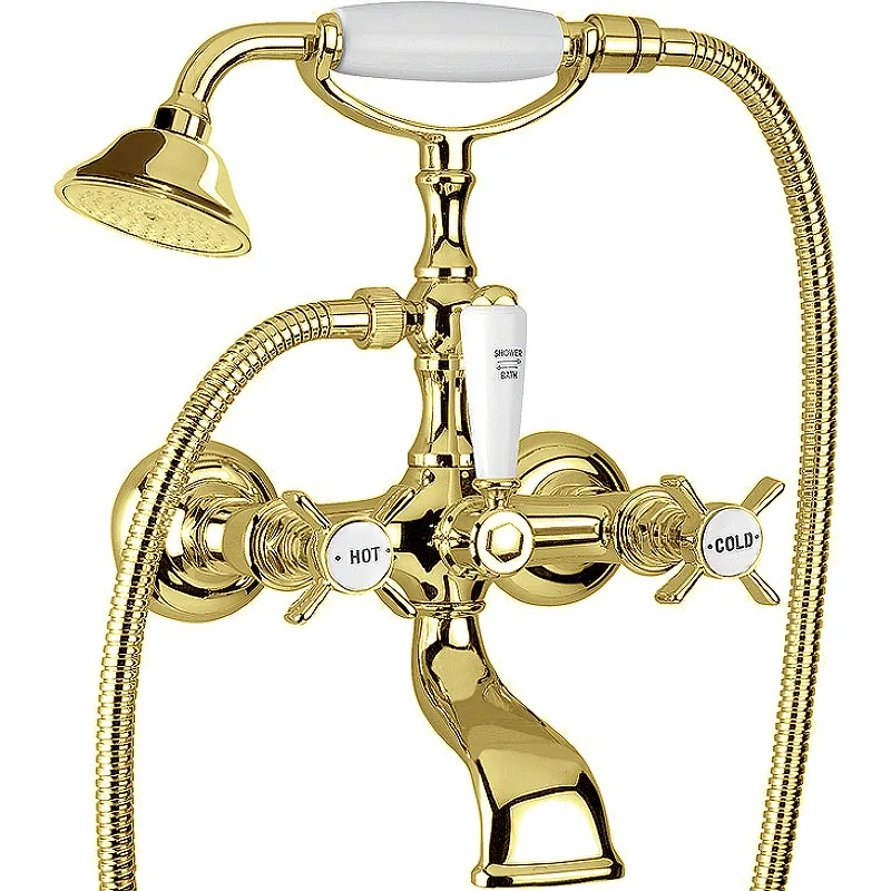 Смеситель для ванны Migliore Princeton 19375 с душевым гарнитуром.Характеристики: Цвет: золото. Материал: латунь. Фиксированный излив. Управление: двухвентильное. Механизм: керамическая кран-букса. Монтаж: на стену. Отверстия для монтажа: 2. Стандарт подводки: G 1/2. С девиатором. Защита от обратного потока. Совместимость с проточным водонагревателем. Длина шланга: 1500 мм. Количество режимов струи ручного душа: 1. Диаметр ручного душа: 76 мм. В комплекте поставки: Смеситель. Ручной душ. Держатель ручного душа. Душевой шланг.