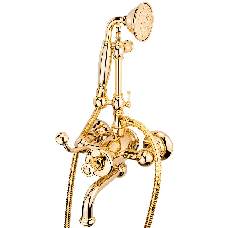 Смеситель для ванны Migliore Vivaldi 19544. Однорычажный смеситель с поворотным изливом и аэратором, с душевым гарнитуром.Характеристики: Монтаж: на стену. Отверстий для монтажа: 2. Стандарт подключения: G 1/2. Материал: высококачественный латунный сплав, который обеспечивает прочность, устойчивость к влаге и температурным перепадам. Покрытие: специальное лаковое покрытие защищает внешнюю часть смесителя от быстрого износа. Цвет: золото. Однорычажная система управления. Оригинальная ручка выполнена из металла. Механизм: керамический картридж. Переключатель на ручной душ. Поворотный излив с аэратором. Душевой гарнитур: ручной душ, металлический шланг 1500 мм, настенный регулируемый держатель. В комплекте поставки: Смеситель. Лейка однофункциональная. Шланг металлический. Подключение к лейке. Настенный регулируемый держатель для душа.