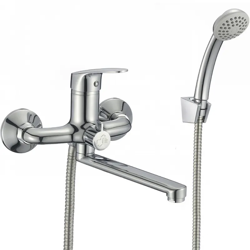 - Хромированный смеситель для ванны с поворотным изливом: Обеспечивает гибкость в использовании и легкость в управлении потоком воды.