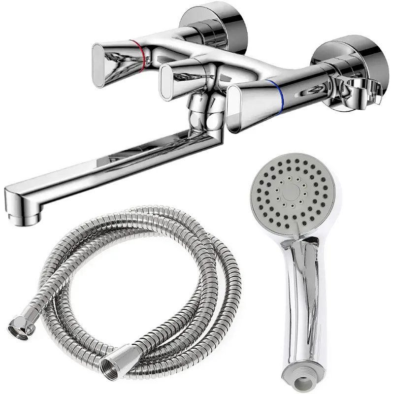 - Смеситель с душевым гарнитуром: В комплекте душевая лейка, шланг и держатель для удобства.
