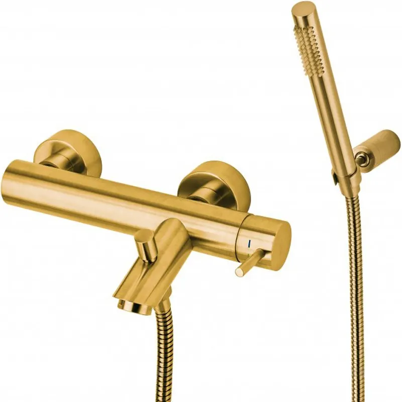 Смеситель для ванны Paffoni Light LIG023HGSP с ручным душем, в золотом цвете брашированный - прекрасно подходит для ванной комнаты, выполненной в стиле модерн. Изготавливается из высококачественного материала. Стильное исполнение и качество не оставят равнодушным никого.Характеристики: Материал: латунь. Поверхность: брашированная. Цвет: золото. Ручной душ (ДхШ): 21 х 3.2 см. Стандарт подключения: жесткая 1/2. Управление: однорычажное. Механизм: керамический картридж. Установка: на стену. В комплекте поставки: Смеситель. Ручная лейка. Держатель для лейки. Душевой шланг. Документация.