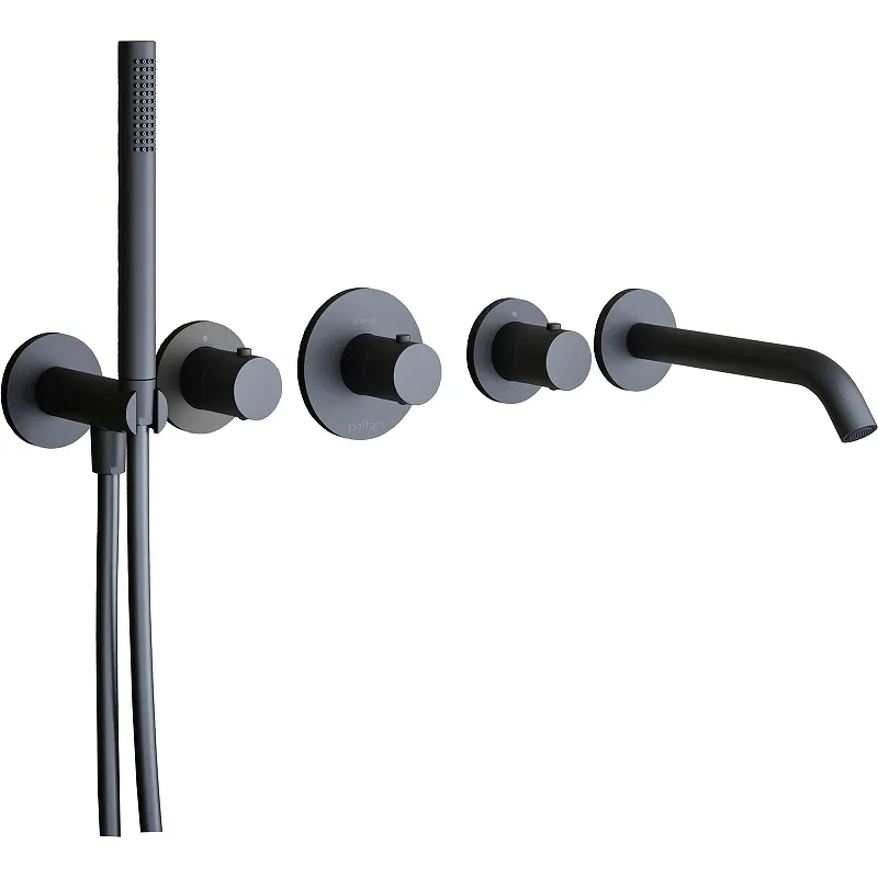 Смеситель для ванны Paffoni Modular Box MDE001NO с термостатом.Характеристики: Цвет: черный матовый. Материал: латунь. С фиксированным изливом. Тип управления: термостат. Монтаж: встраиваемый. Количество монтажных отверстий: 5 шт. Термостатический картридж. Стандарт подключения: G 1/2. В комплекте поставки: Смеситель (внешняя часть). Душевой шланг с лейкой и настенным держателем.