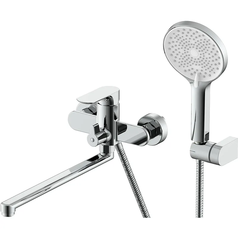 - С душевым гарнитуром: в комплект входят ручной душ с тремя режимами струи, шланг и держатель, что расширяет функциональность смесителя.