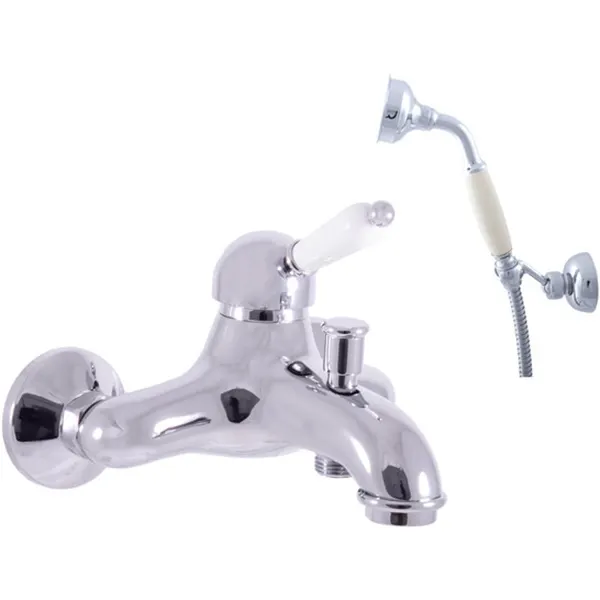 Смеситель для ванны с ручным душем Rav Slezak Labe L554.5/2 - выполнен в стиле «ретро», станет прекрасным дополнением для оформления ванной комнаты в классическом стиле. Создаст атмосферу уюта и тепла.Особенности конструкции:Внутри смеситель оснащен 35 мм керамическим картриджем KEROX KA3501 венгерского производства. Обладает высокой степенью надежности, а также эффективен от образования извести и ржавчины.Короткий, но широкий излив способствует быстрому, но экономичному набору воды. Удобный кнопочный дивертор одним легким нажатием перенаправляет поток в ручной душ. Подача воды в ручной душ осуществляется через гибкий шланг с металлической оплеткой.Принцип установки:установка производится на посадочные места жесткой подводки в стене.Конструкция: Покрытие: глянцевый хром. Ручка смесителя: керамическая, цвет белый с золотыми кольцами у оснований. Ручка душевой лейки: керамическая, цвет кремовый. Материал: высокопрочная латунь. Механизм: керамический картридж. Подводка: жесткая, G 1/2. В комплекте поставки: Смеситель; Душевая лейка; Эксцентрики; Экраны для установки на эксцентрики; Комплект креплений.