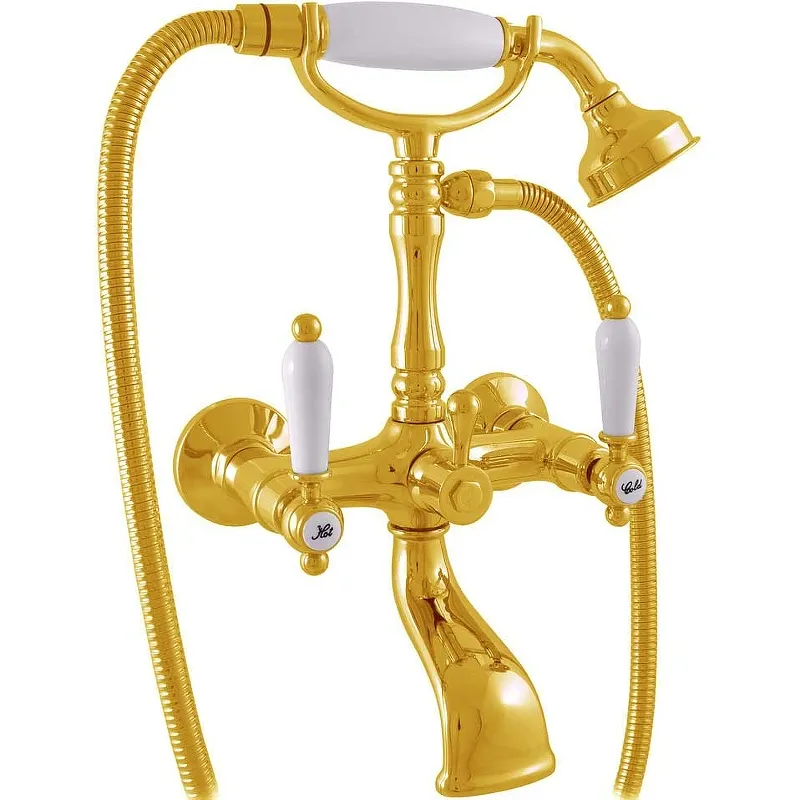 Смеситель для ванны Rav Slezak Morava retro MK560.5/2Z.Характеристики: Цвет: золото. Материал: латунь. Механизм: керамические кран-буксы. Тип управления: двухвентильный. Излив: фиксированный. Аэратор. Шланг металлический с двойной оплеткой, длиной 1500 мм. Латунная душевая лейка с керамической ручкой. Стандарт подводки: 1/2. Отверстий для монтажа: 2. Монтаж: настенный. В комплекте поставки: Смеситель. Душевой шланг. Душевая лейка. Держатель для лейки.