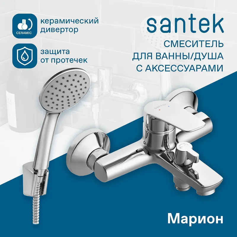 Смеситель для ванны Santek Марион WH5A10006C001 с душевым гарнитуром.Характеристики: Цвет: хром. Материал: латунь. Управление: однорычажное. Механизм: керамический картридж 35 мм. Излив: фиксированный. Стандарт подводки: G 1/2. Поворотный керамический переключатель ванна/душ. Аэратор. Количество режимов струи ручного душа: 1. Длина душевого шланга: 1500 мм. Монтаж: на стену. В комплекте поставки: Смеситель для ванны. S-образные эксцентрики. Ручной душ. Душевой шланг. Держатель ручного душа. Монтажный комплект. Инструкция.