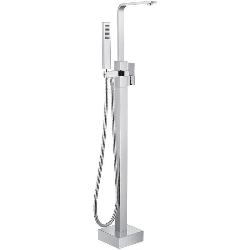 - Напольный смеситель с душевым гарнитуром: В комплект входит ручной душ и шланг, что расширяет функциональные возможности.