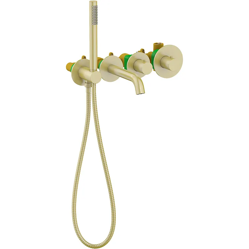 Смеситель для ванны Timo Saona 2324/17YSM с термостатом.Характеристики: Цвет: золото матовое. Материал: латунь. Управление: термостат. Механизм: термостатический картридж. С фиксированным изливом. Количество режимов ручного душа: 1. Длина шланга: 1500 мм. Отверстия для монтажа: 4. Стандарт подключения: G 1/2. Монтаж: встраиваемый. В комплекте поставки: Встраиваемый блок управления смесителем. Декоративные накладки - 4 шт. Соединительные трубки - 2 шт. Гайка. Декоративные гильзы - 2 шт. Держатель ручной лейки с подключением шланга (латунный). Излив. Ручка управления термостатом. Ручка управления дивертором. Ручная лейка (латунная). Шланг душа (латунный). Гаечный ключ. Инструкция.