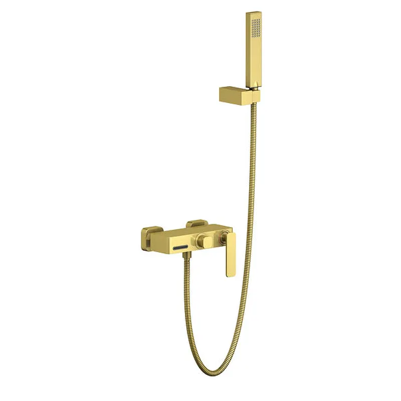 Цвет: золото. Материал: высококачественная латунь. Душевой гарнитур: металлический шланг длиной 150 см, настенное поворотное крепление, 1-функциональная лейка. Стандарт подключения: G 1/2. Монтаж: на стену. В комплекте поставки: смеситель, душевой гарнитур.
